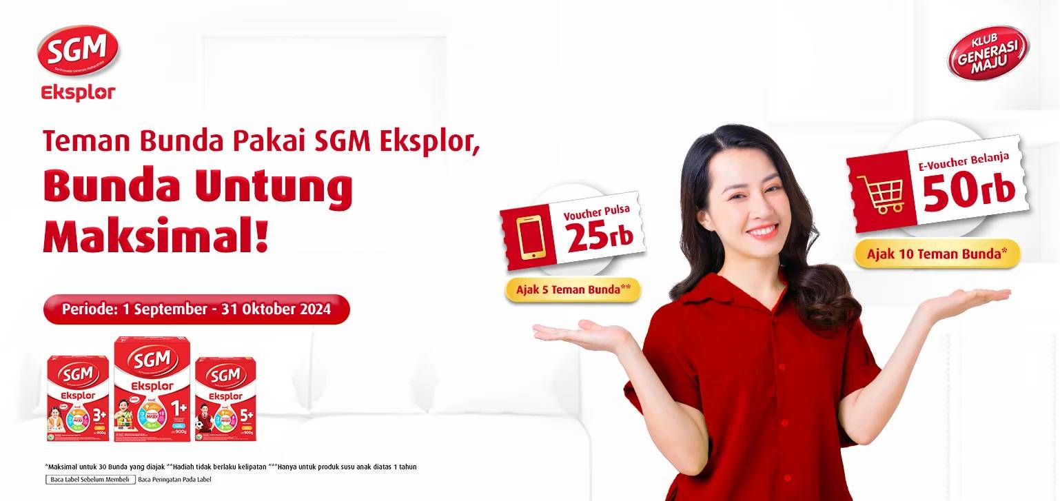 - Voucher pulsa Rp25,000,- (dua puluh lima ribu rupiah) untuk setiap 5 (lima) Bunda yang berhasil di ajak gabung KGM dan masing-masing submit kode unik pertama kali sebanyak minimal 1x900 gram SGM Eksplor 1+/3+/5+ atau 1x700 gram SGM Eksplor ISOPRO SOY 1+. Tidak berlaku kelipatan selama periode program.